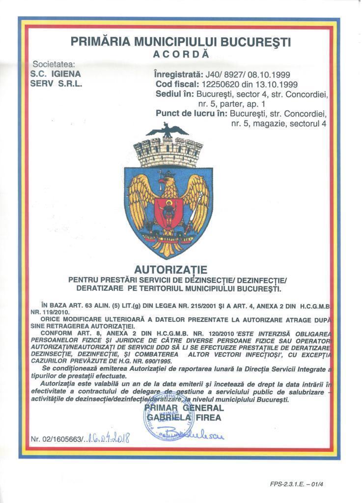 IGIENA SERV prestator autorizat la nivel national pentru servicii de dezinfectie, dezinsectie, deratizare va ofera servicii profesionale de combatere a daunatorilor si solutii optime pentru prevenirea aparitiei lor in TOATA ROMANIA pentru: spitale, scoli, institutii publice si private, restaurante, hoteluri, magazine, industrie alimentara, spatii de depozitare, ferme, subsolurile blocurilor, beciuri, hambare etc.